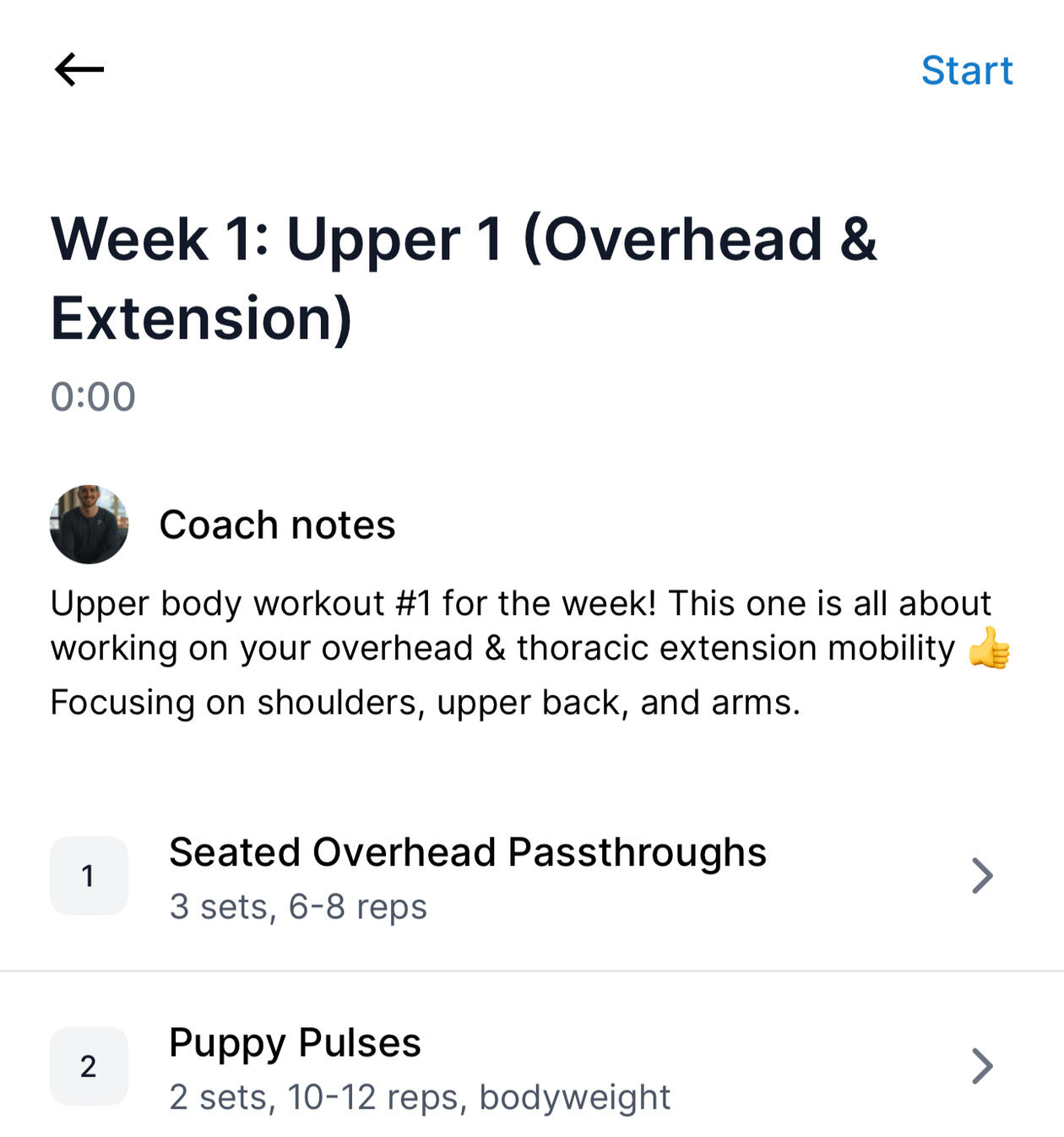 - and if you're lucky - some form of stretch.. maybe just a low effort forward fold?No strengthening, not even close enough demands for any lengthening, and the opposite of mobilizing (all you did was stability work)Compare that to just 1 of our workouts; this is an exact day in our program - (week 1, workout 2)- Seated overhead passthroughs; building back strength, lower back endurance